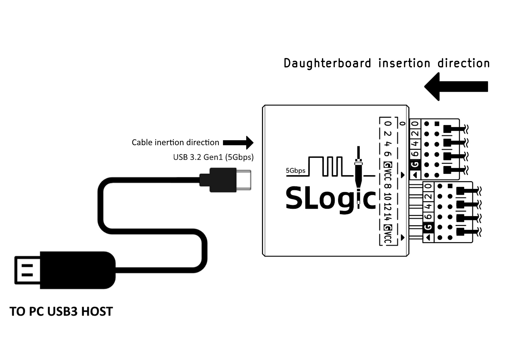 First, connect PC USB3 → USB-A/C to USB-C → SLogic → Ribbon cable/Coaxial Cable Module