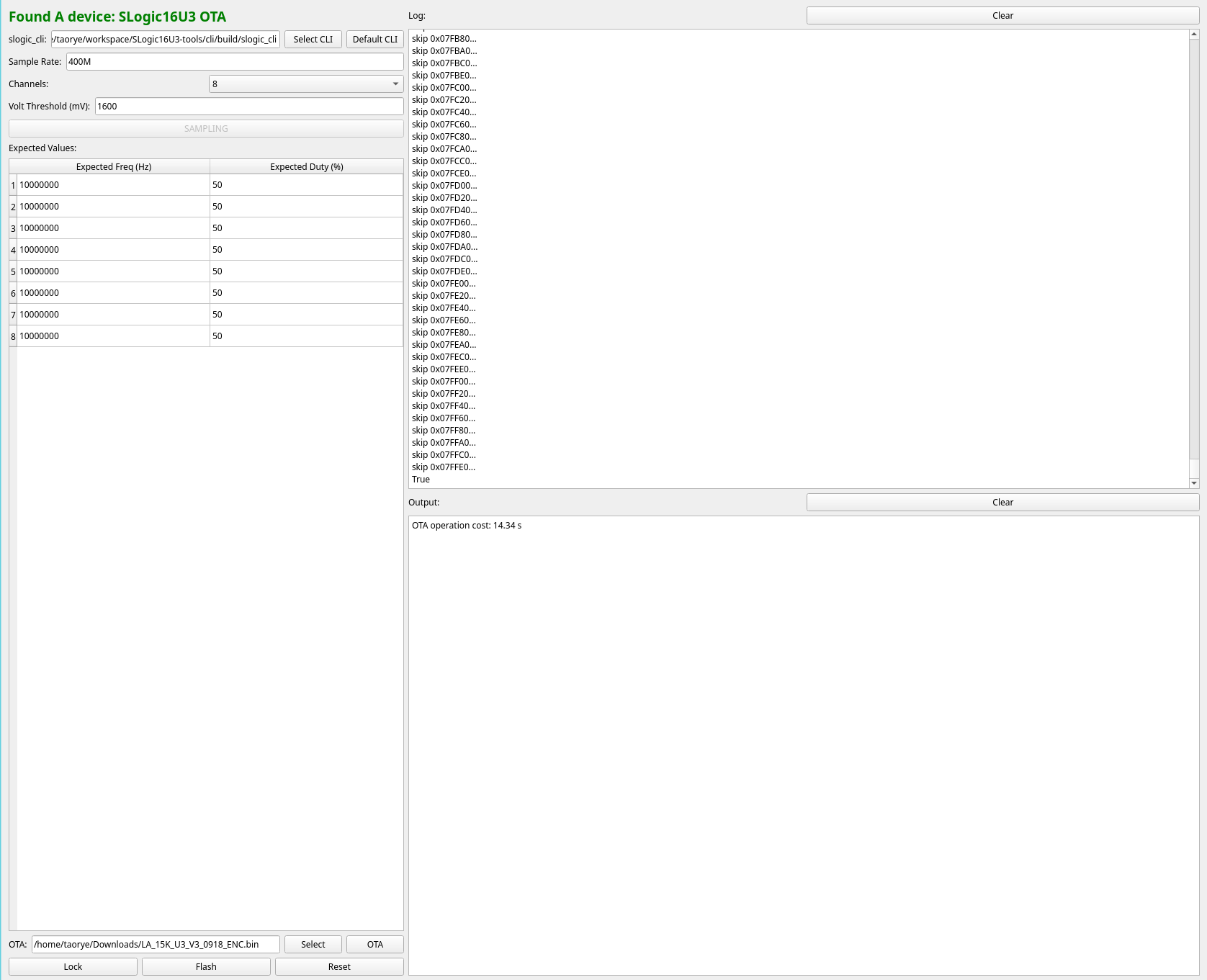 - 按下设备上的 mode 按钮。GUI 应显示 "SLogic16U3 OTA"。